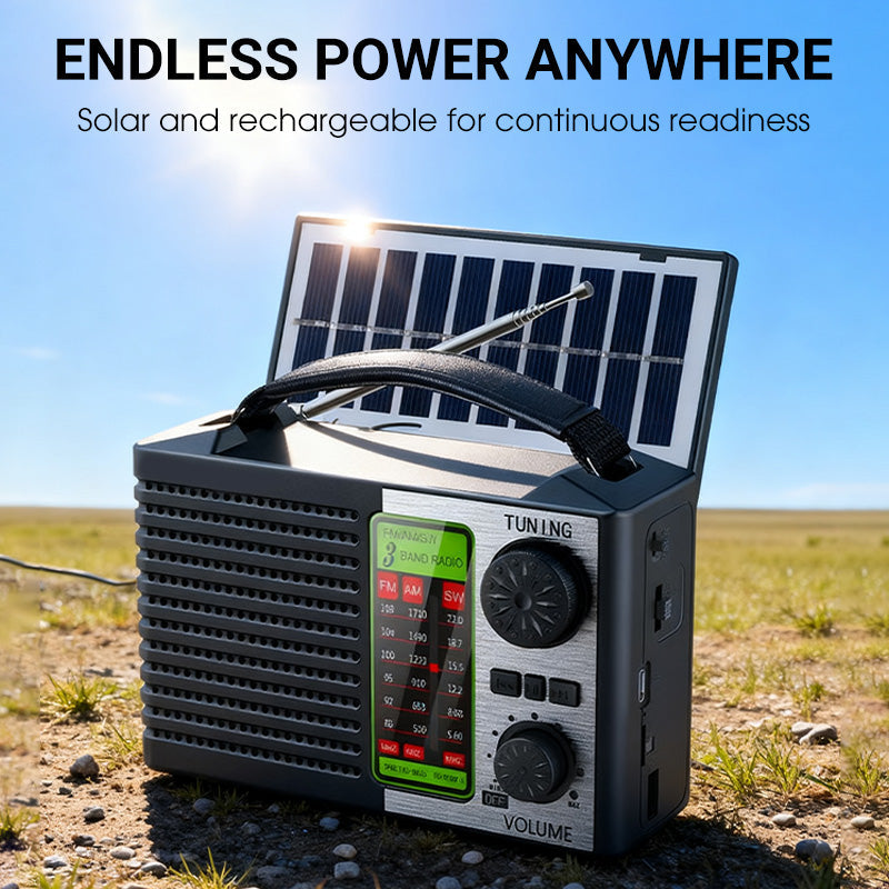 VERSATILE DUAL POWER - Never worry about losing power. This radio runs on a rechargeable battery or the built-in 180° foldable solar panel, ensuring you stay connected and informed anywhere.